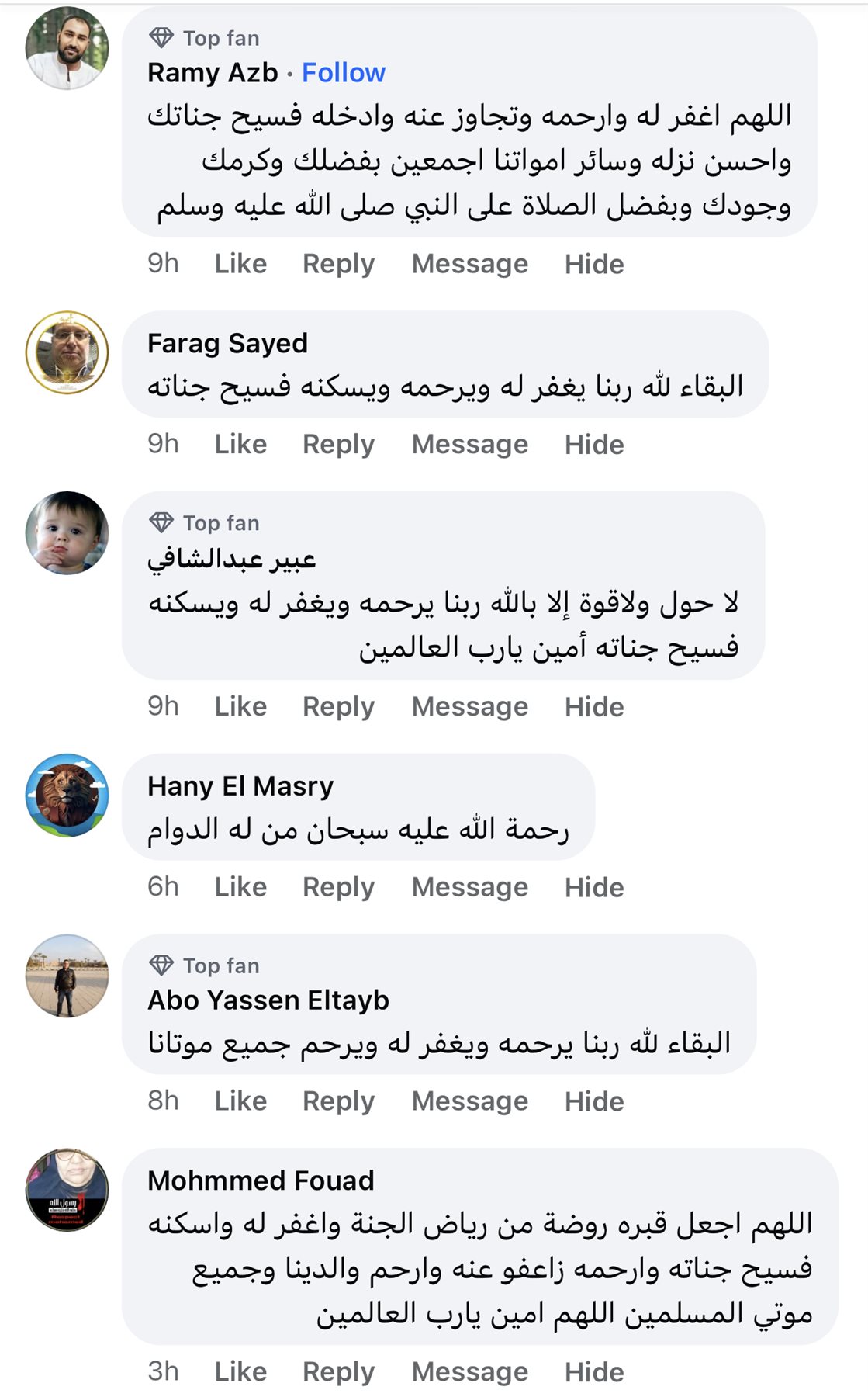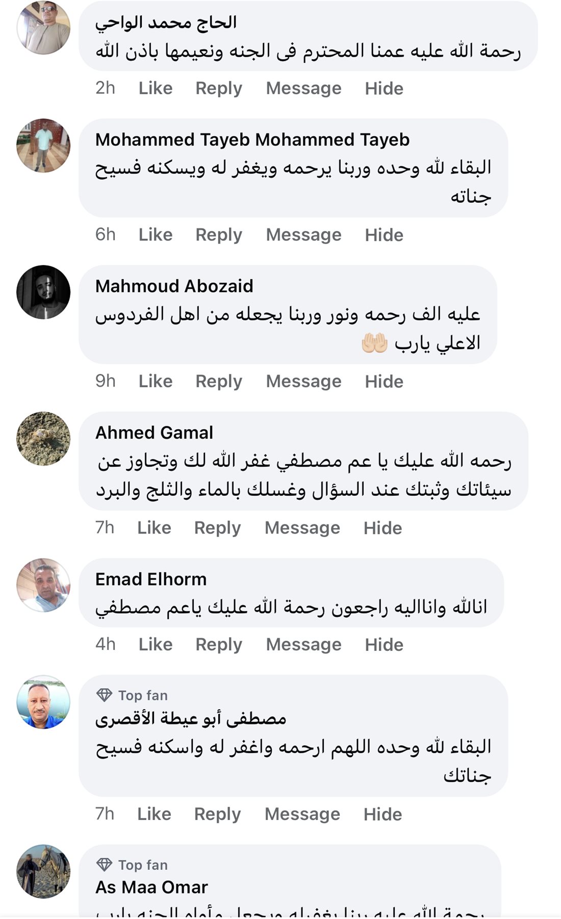 وانهالت التعليقات الحزينة فور سماع خبر وفاة العم مصطفى، الذي وافته المنية عقب صلاة الجمعة، داعين الله عز وجل أن يتغمده بواسع رحماته وأن يغفر له ويسكنه جنات النعيم.