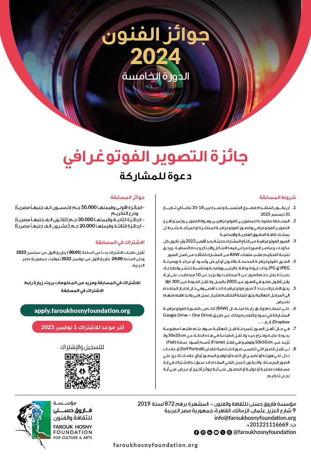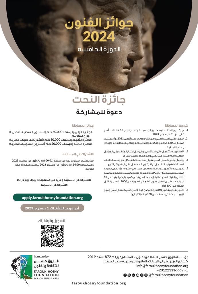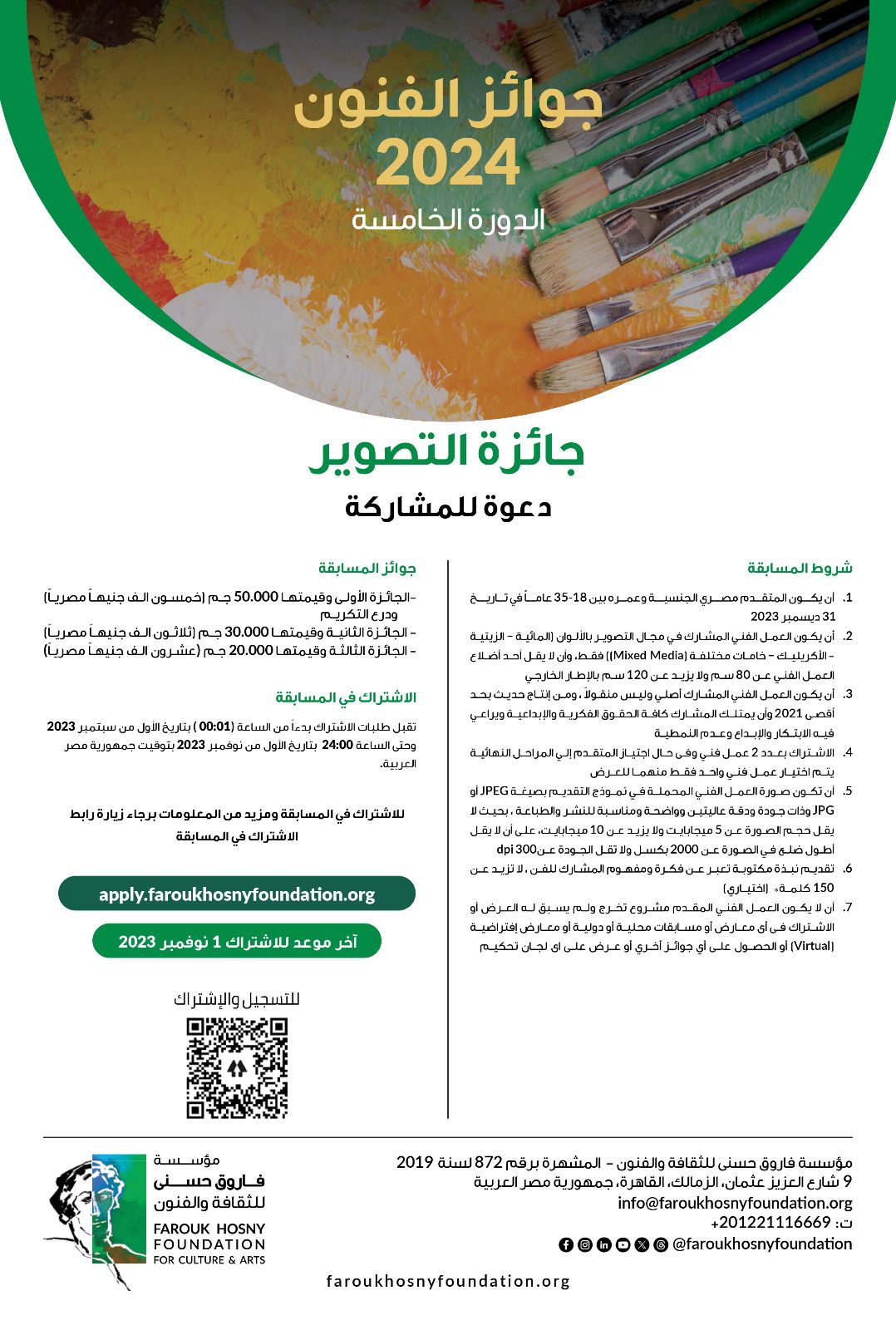 أعلنت مؤسسة فاروق حسني للثقافة والفنون شروط الاشتراك في جوائز الفنون الدورة الخامسة لعام 2024 في مجالات التصوير: الرسم – العمارة – النحت – النقد الفني التشكيلي – التصوير الفوتوغرافي.