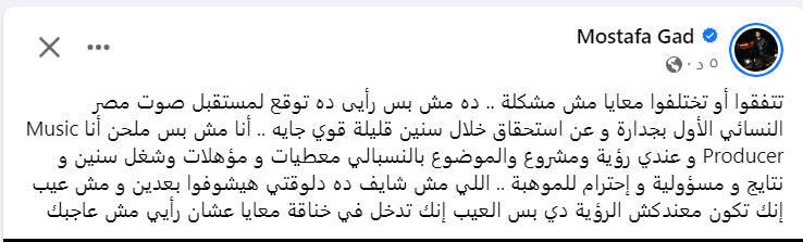 وأضاف مصطفى جاد: أنا مش بس ملحن أنا Music Producer وعندي رؤية ومشروع والموضوع بالنسبالي معطيات ومؤهلات وشغل سنين ونتايج ومسؤولية واحترام للموهبة.. اللي مش شايف ده دلوقتي هيشوفوا بعدين ومش عيب إنك تكون معندكش الرؤية دي بس العيب إنك تدخل في خناقة معايا عشان رأيي مش عاجبك.