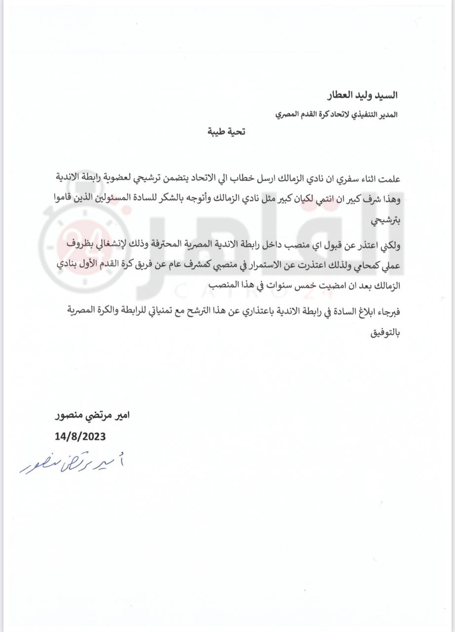 وأرسل أمير مرتضي منصور خطابًا إلي اتحاد الكرة -حصل القاهرة 24- على نسخة منه جاء نصه: “علمت أثناء سفري ان نادي الزمالك أرسل خطاب إلي الاتحاد يتضمن ترشيحي لعضوية رابطة الأندية وهذا شرف كبير إن أنتمي لكيان كبير مثل نادي الزمالك وأتوجه بالشكر للسادة المسئولين الذين قاموا بترشيحي.. ولكني أعتذر عن قبول أي منصب داخل رابطة الأندية المصرية المحترفة وذلك لانشغالي بظروف عملي كمحامٍ ولذلك اعتذرت عن عدم الاستمرار في منصبي كمشرف عام عن فريق كرة القدم الأول بنادي الزمالك بعد أن أمضیت خمس سنوات في هذا المنصب.. فبرجاء إبلاغ السادة في رابطة الأندية اعتذاري عن هذا الترشح مع تمنياتي للرابطة والكرة المصرية بالتوفيق”.
