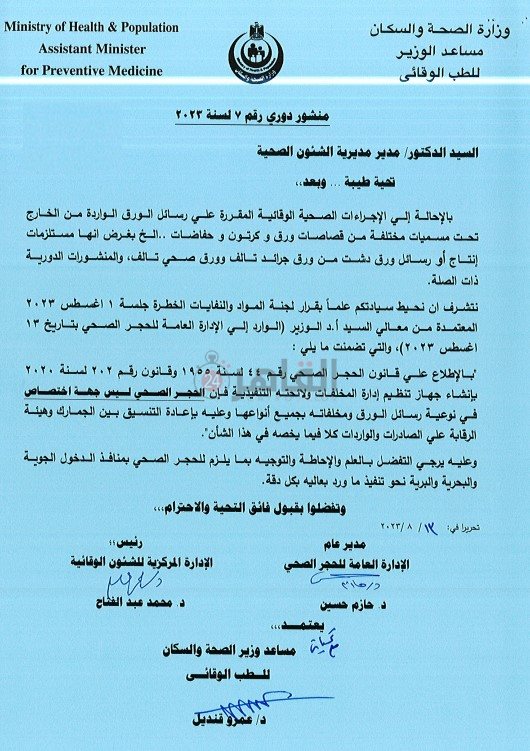 وجهت وزارة الصحة والسكان، ممثلة في قطاع الطب الوقائي، تعليمات إلى الحجر الصحي بمديرية الشئون الصحية، بشأن الإجراءات الصحية الوقائية المقررة على رسائل الورق الواردة من الخارج تحت مسميات مختلفة من قصاصات ورق وكرتون وحفاضات، بغرض أنها مستلزمات إنتاج أو رسائل ورق دشت من ورق جراند تالف وورق صحي تالف.