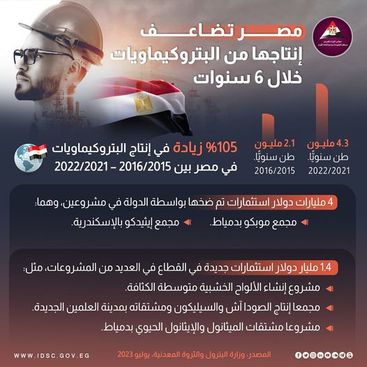 وتابع: مصر تضاعف إنتاجها من البتروكيماويات خلال 6 سنوات، 105% زيادة في إنتاج البتروكيماويات، في مصر بين 2016/2015 - 2022/2021.