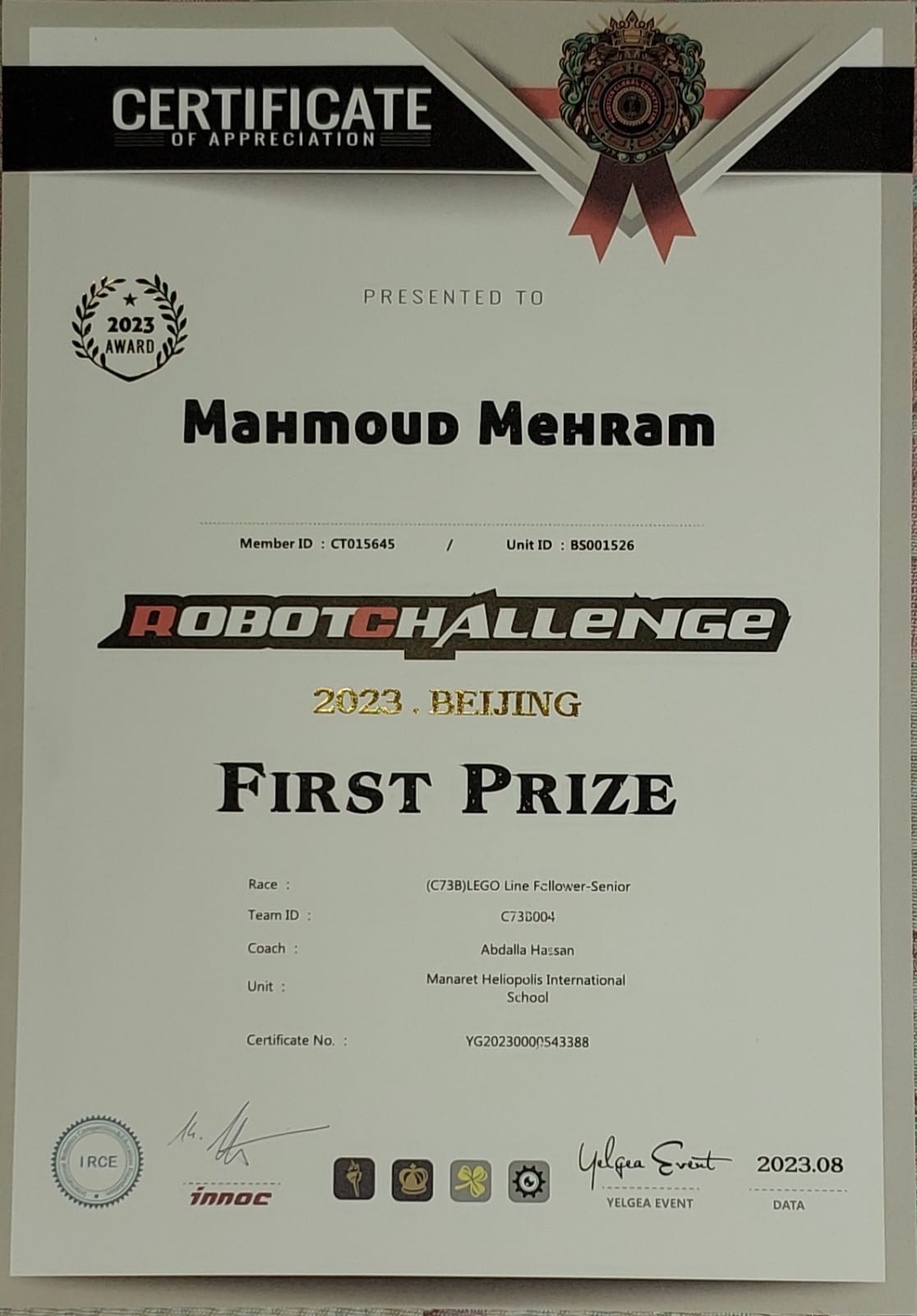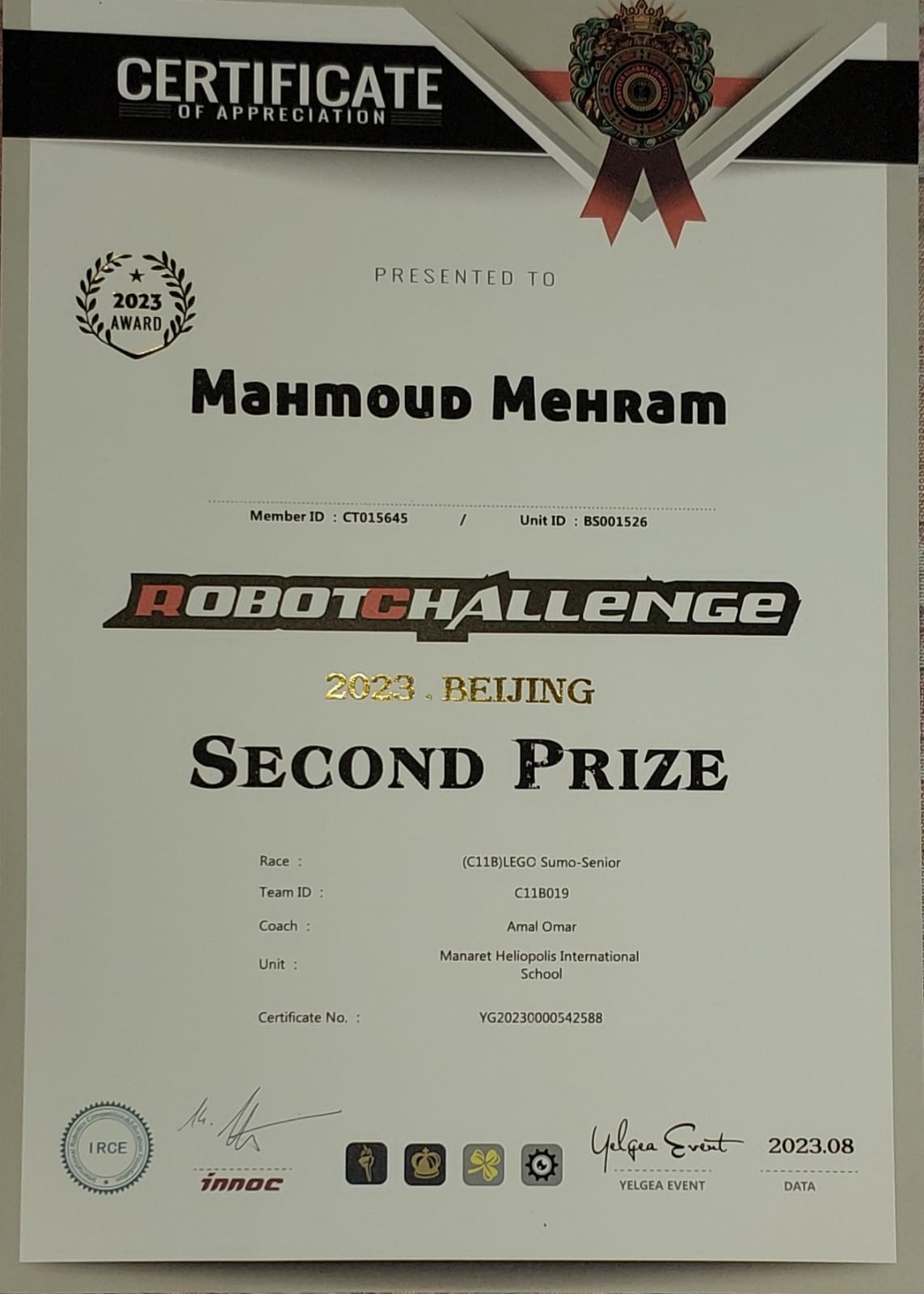 وشارك الطفل محمود محمد صبحي في مسابقة لروبوتات بالصين في جامعة بيكين الدولية من يوم 10 الى 13 أغسطس 2023، وتعد تلك المسابقة أقوى مسابقه دوليه في مجال الروبوت على مستوى العالم بمشاركه 29 دولة وأكثر من 1600 فريق.