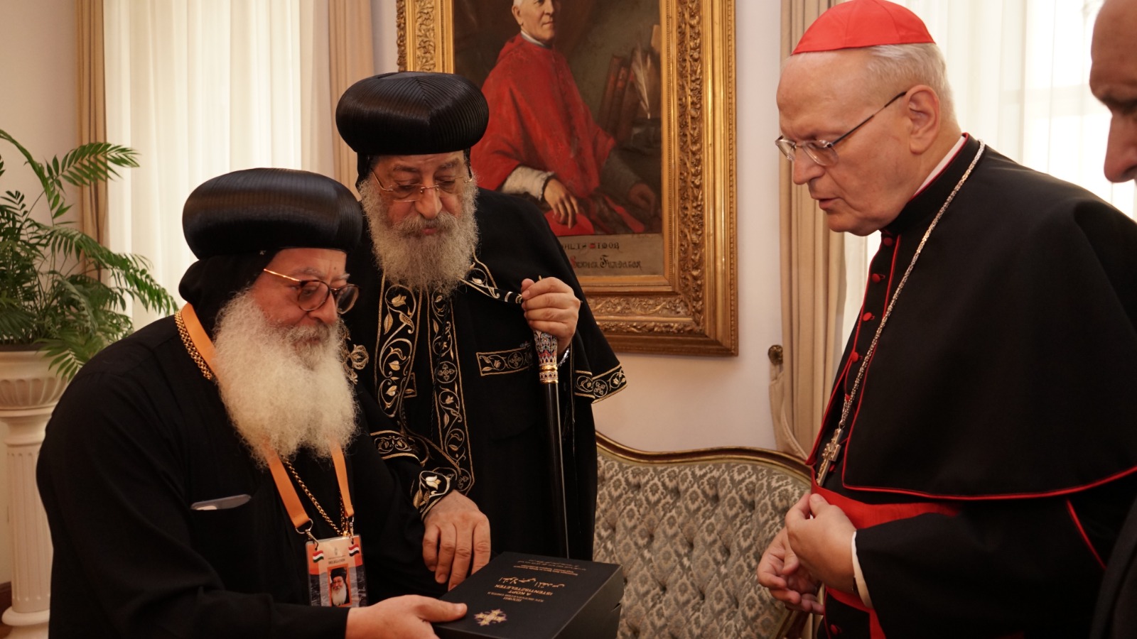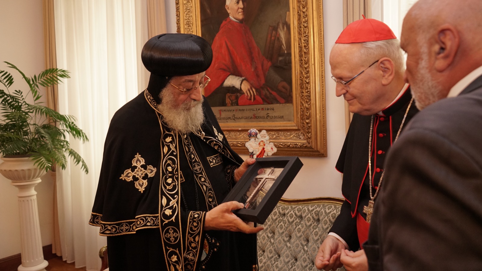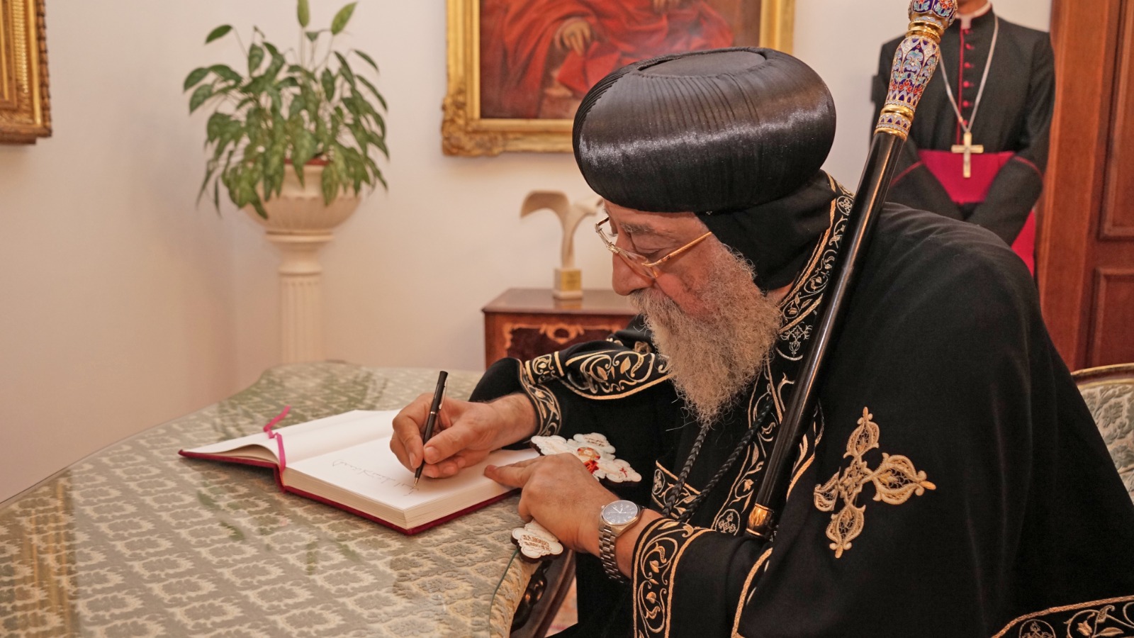 وأعرب قداسة البابا في بداية اللقاء عن سعادته بهذا اللقاء، مشيرًا إلى أنه زار الڤاتيكان في مايو الماضي، بمناسبة مرور 50 سنة على العلاقات بين الكنيستين القبطية والكاثوليكية، وأنه التقى قداسة البابا فرنسيس الذي تربطه بقداسته علاقة قوية، وأكد قداسته على أن الكنيسة القبطية الأرثوذكسية كنيسة شاهدة للمسيح، وأن العلاقات قوية التي تربط الكنيسة برئيس الجمهورية وإخوتنا المسلمين، وأن الأقباط في مصر عددهم 15 مليون قبطي.