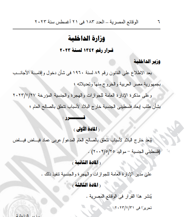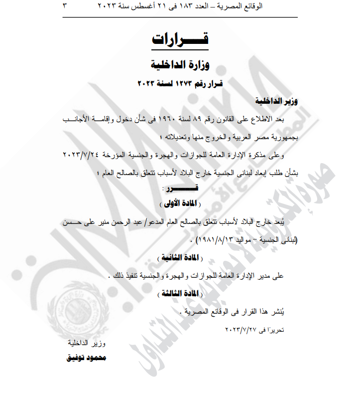 نشرت الجريدة الرسمية قراري اللواء محمد توفيق، وزير الداخلية رقم 1273 و1342 لسنة 2023 بشأن استبعاد مواطنين لبناني وفلسطيني الجنسية خارج البلاد لأسباب تتعلق بالصالح العام.
