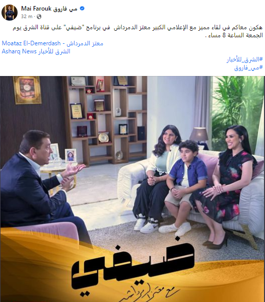 تحل الفنانة مي فاروق، ضيفة على برنامج ضيفي، الذي يقدمه الإعلامي معتز الدمرداش، عبر قناة الشرق الإخبارية، وذلك يوم الجمعة الموافق 25 أغسطس في تمام الثامنة مساء.