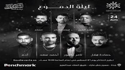 يستعد عدد من الفنانين، لإحياء حفل جديد على مسرح بنش مارك بجدة، بالمملكة العربية السعودية، تحت عنوان ليلة الدموع، يوم الخميس المقبل 24 أغسطس، أبرزهم أحمد سعد، وتامر عاشور.