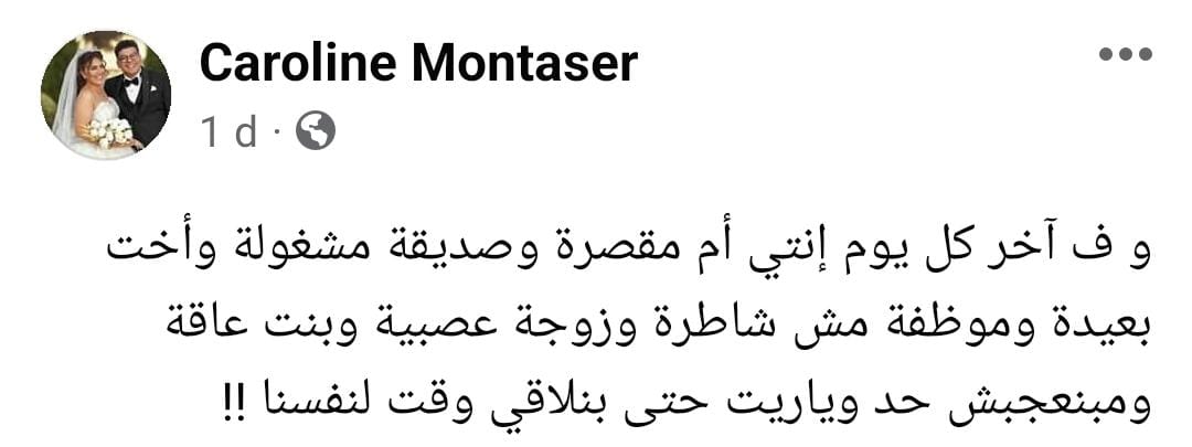نشرت كارولين على حسابها الخاص عبر فيس بوك، أمس الثلاثاء، منشور تعاطف معه رواد مواقع التواصل الاجتماعي، حيث قالت: وفي آخر كل يوم إنتي أم مقصرة وصديقة مشغولة وأخت بعيدة وموظفة مش شاطرة وزوجة عصبية، وبنت عاقة ومبنعجبش حد وياريت حتى بنلاقي وقت لنفسنا.
