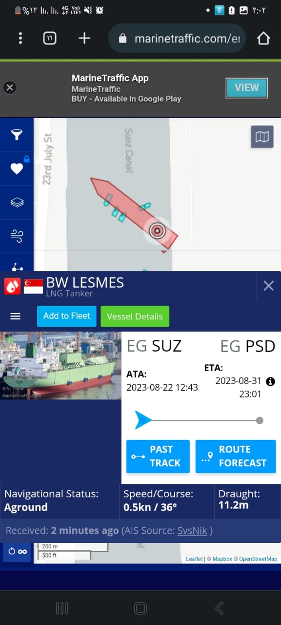 نجحت الهيئة العامة لقناة السويس في تعويم ناقلة غاز طبيعي مسال BW LESMES، جنحت بالمجرى الملاحي للقناة، في الساعات المبكرة من صباح يوم الأربعاء، دون تعطل المجرى الملاحي.