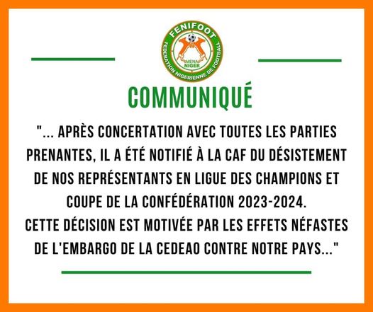 وأصدر الاتحاد النيجري لكرة القدم بيانا رسميا اليوم عبر حساباته على مواقع التواصل الاجتماعي، يعلن خلاله الانسحاب من بطولتي الاتحاد الإفريقي، وذلك بسبب الحصار الاقتصادي الذي تعاني منها البلاد.