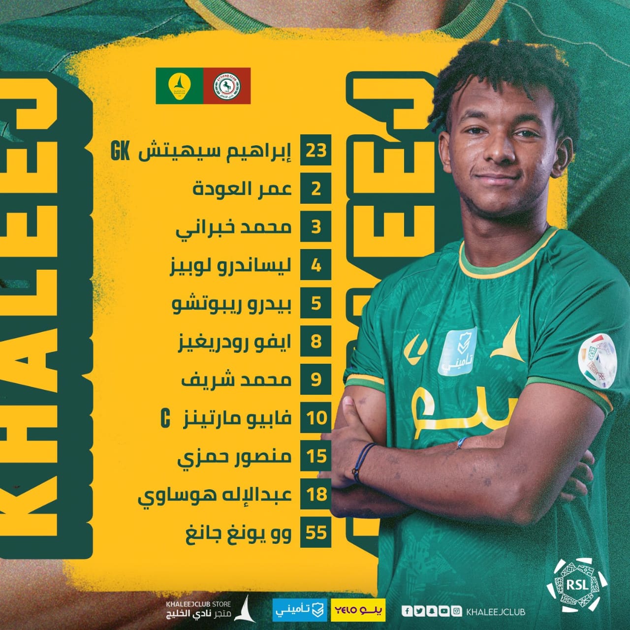 وأعلن بيدرو إيمانويل المدير الفني لفريق الخليج تشكيل فريقه لمواجهة الاتفاق، والذي يشهد ظهور محمد شريف والمنتقل حديثًا للفريق من صفوف الأهلي.
