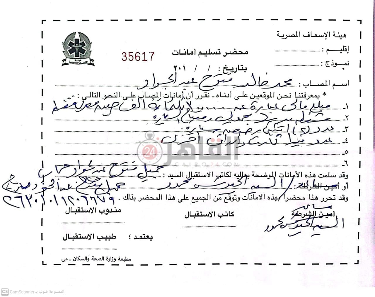 ويروي السيد الجيوشي، أنه فور وصوله إلى مستشفى جمصة المركزي، تم تحرير محضر بتسلم المتعلقات الشخصية والمبالغ المالية، في حضور أحد من أهالي المصاب، مؤكدا على شكر الأهالي له لأمانته.