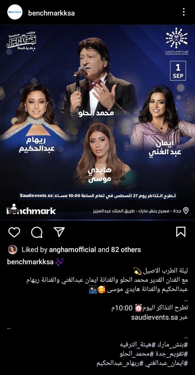 وأعلنت الصفحة الرسمية لمسرح بنش مارك، على موقع انستجرام، عن الحفل الذي سيجمع كل هؤلاء، مشيرةً إلى أن تذاكر الحفل سيتم طرحها اليوم في تمام الساعة العاشرة مساء، وكتبت تعليق: ليلة الطرب الأصيل، مع الفنان القدير محمد الحلو، والفنانة إيمان عبد الغني وريهام عبدالحكيم وهايدي موسى.