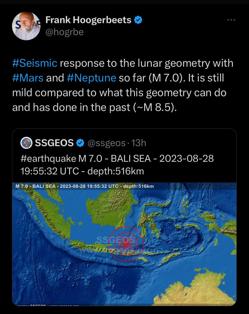 وحذر العالم الهولندي فرانك هوجربيتس، من أن الأرض تتحرك ببطء بين المريخ ونبتون، مشيرًا إلى أنه قد سبق وحذر من هذه الهندسة منذ نوفمبر الماضي متوقعا نشاطا زلزاليا ضخما وفرصة لحدوث هزة أرضية عنيفة.