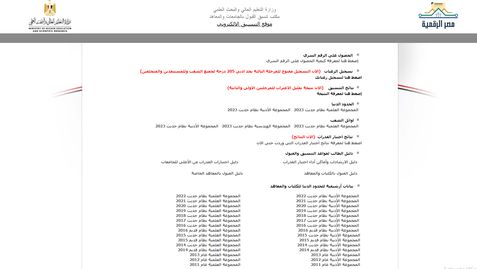 أتاح موقع التنسيق الإلكتروني، التسجيل في تنسيق المرحلة الثالثة 2023 للطلاب الناجحين في الدور الأول للثانوية العامة هذا العام 2023، وكذلك المُتخلفين من المرحلتين الأولى والثانية لتدوين رغباتهم، وذلك عبر موقع التنسيق الإلكتروني حتى يوم الجمعة الموافق 1/9/2023.