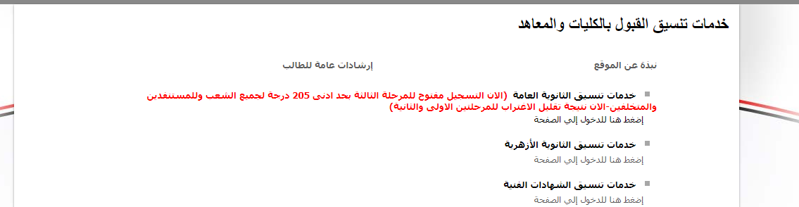 حيث ظهرت عبر خانة خدمات تنسيق الثانوية العامة جملة: الآن التسجيل مفتوح للمرحلة الثالثة بحد ادنى 205 درجة لجميع الشعب وللمستنفدين والمتخلفين-الآن نتيجة تقليل الاغتراب للمرحلتين الأولى والثانية، وبعد الضغط علي خدمات الثانوية العامة تظهر خانة تسجيل الرغبات وبجانبه جملة: الآن التسجيل مفتوح للمرحلة الثالثة بحد ادنى 205 درجة لجميع الشعب وللمستنفدين والمتخلفين).ضغط هنا لتسجيل رغباتك