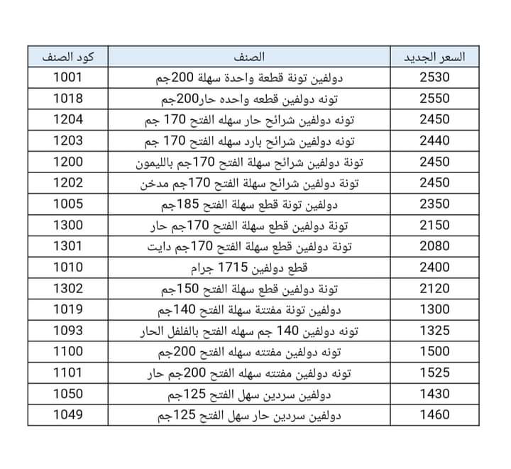 وارتفعت أسعار سردين دولفين سهل الفتح وحار سهل الفتح 200 جرام ليسجل سعر الكرتونة الواحدة 1525 جنيها، وارتفعت أسعار تونة دولفين شرائح سهلة الفتح بجميع أنواعها لتسجل سعر الكرتونة الواحدة 2450 جنيها.