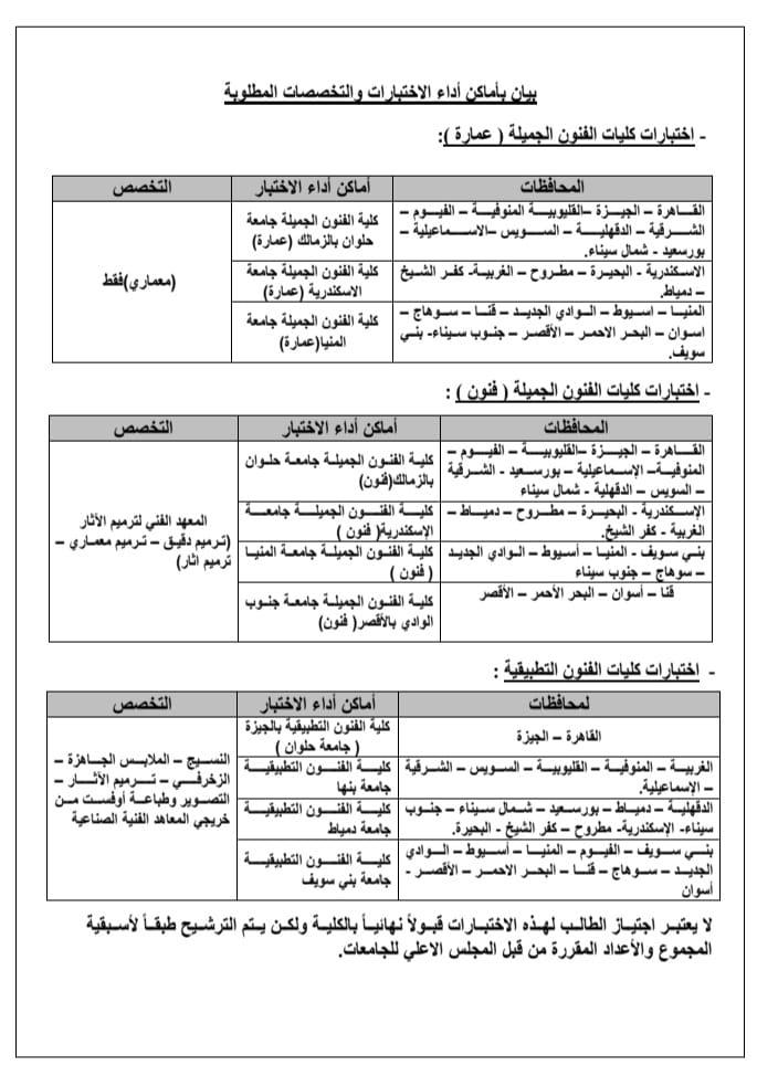 - كليات الفنون الجميلة "عمارة – فنون" بجامعات “حلوان – الإسكندرية – المنيا – جنوب الوادي بالأقصر {فنون} فقط”.