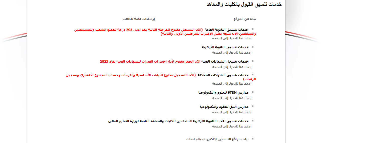 - يتم تزويد برنامج التنسيق الإلكتروني بأسماء وبيانات الطلاب الذين اجتازوا هذه الاختبارات ليتم الترشيح بناءً عليها وتكون الكليات مسئولة مسئولية كاملة عن هذه النتائج في خلال الفترة الزمنية المخصصة لذلك حيث لن يعتد بأي نتائج أخري بعد إغلاق موقع التنسيق الالكتروني لتسجيل الطلاب اللائقين في هذه الاختبارات.