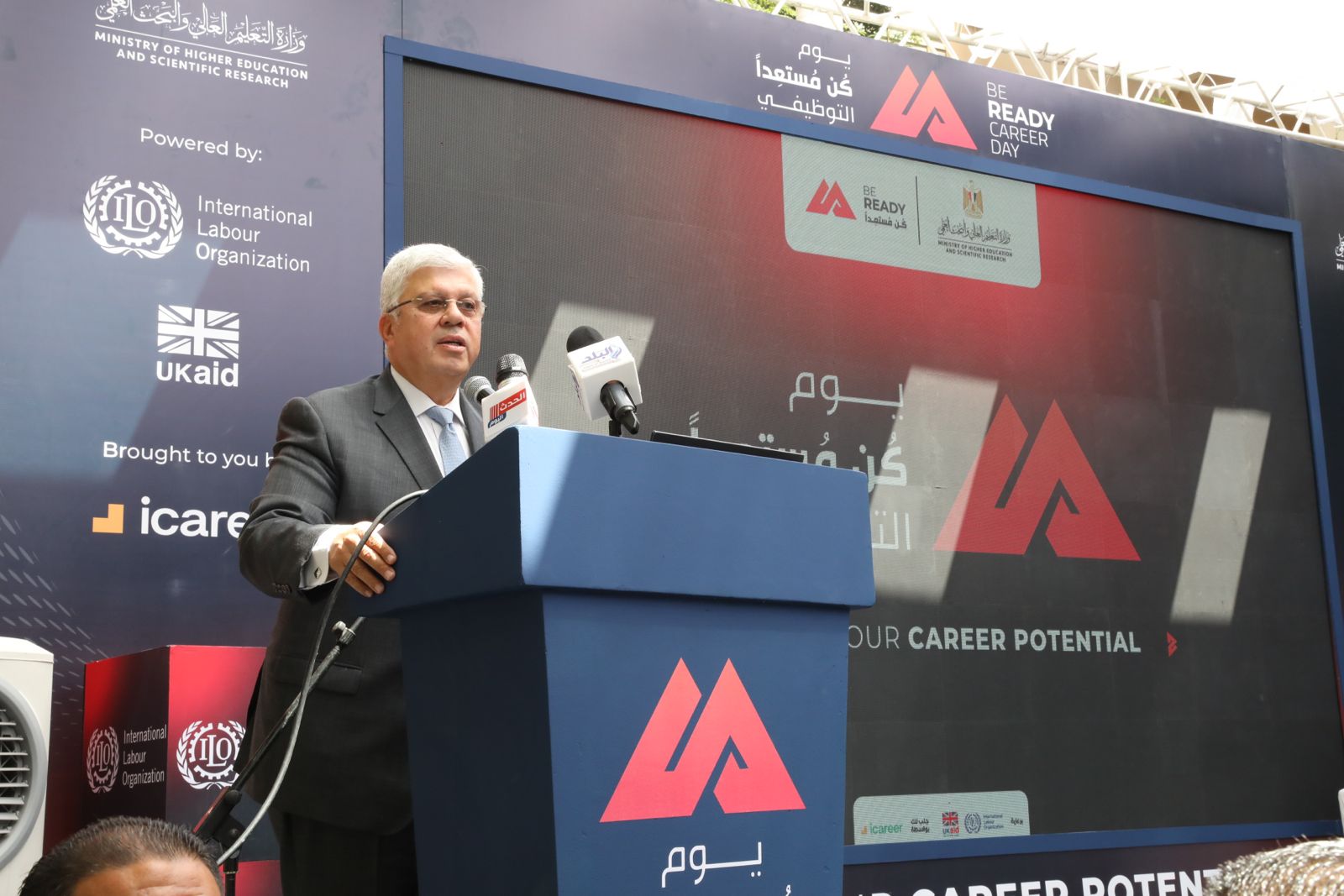 وفي كلمته، أوضح وزير التعليم العالي أن هذا المُلتقى يعُد أحد فعاليات مبادرة كن مستعدًا BeReady كأحد أنشطة برنامج التعليم العالي للإرشاد المهني من أجل التوظيف؛ وهو برنامج يتم تنفيذه برعاية وزارة التعليم العالي وبدعم من المملكة المتحدة وينفذه مكتب منظمة العمل الدولية بالقاهرة، مستعرضًا دور الوزارة والجامعات المصرية في تأهيل الخريجين وتزويدهم بالمهارات والمعرفة اللازمة للحصول على فرص عمل مناسبة، لافتًا إلى تسجيل أكثر من 18 ألف طالب في مبادرة كن مستعدًا من 20 جامعة مصرية.