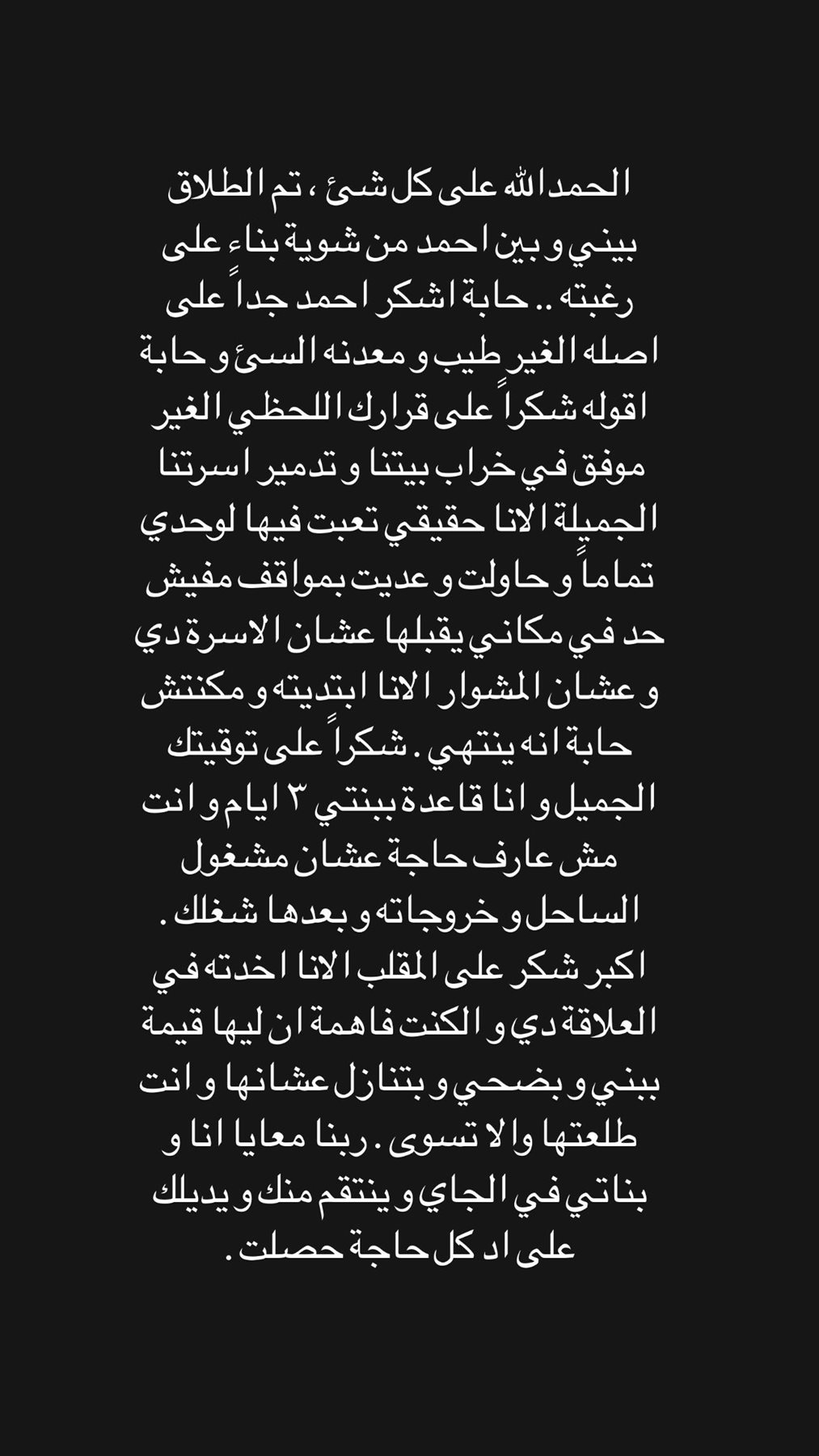 واستكملت علياء بسيوني: حابة أشكر أحمد جدًا على أصله غير الطيب ومعدنه السيئ وحابه أقوله شكرًا على قرارك اللحظي غير الموفق في خراب بيتنا وتدمير أسرتنا الجميلة، اللي أنا حقيقي تعبت فيها لوحدي تمامًا وحاولت وعديت بمواقف مفيش حد في مكاني يقبلها عشان الأسرة دي.