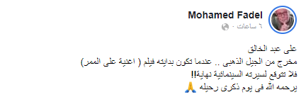 وكتب محمد فاضل منشورًا عبر حسابه الشخصي بموقع التواصل الاجتماعي فيس بوك، جاء فيه: علي عبد الخالق مخرج من الجيل الذهبي، عندما تكون بدايته فيلم أغنية على الممر، فلا تتوقع لسيرته السينمائية نهاية.. الله يرحمه.