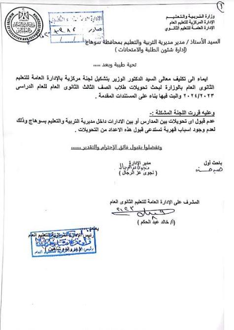 وجاء نص البيان كالتالي: إيماء إلى تكليف الدكتور الوزير بتشكيل لجنة مركزية بالإدارة العامة للتعليم الثانوي العام بالوزارة، لبحث تحويلات طلاب الصف الثالث الثانوي العام للعام الدراسي 2023/ 2024 والبت فيها بناء على المستندات المقدمة، قررت اللجنة المشكلة عدم قبول أي تحويلات بين المدارس أو بين الإدارات داخل مديرية التربية والتعليم بسوهاج وذلك لعدم وجود أسباب قهرية تستدعي قبول هذه الأعداد من التحويلات.