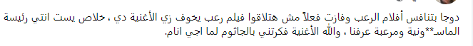 وعلق حساب وقال: دوجا بتنافس أفلام الرعب وفازت فعلًا مش هتلاقوا فيلم رعب يخوف زي الأغنية دي، خلاص يا ستي انتي رئيسة الماسونية ومرعبة عرفنا، والله الأغنية فكرتني بالجاثوم لما اجي أنام.