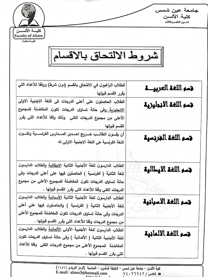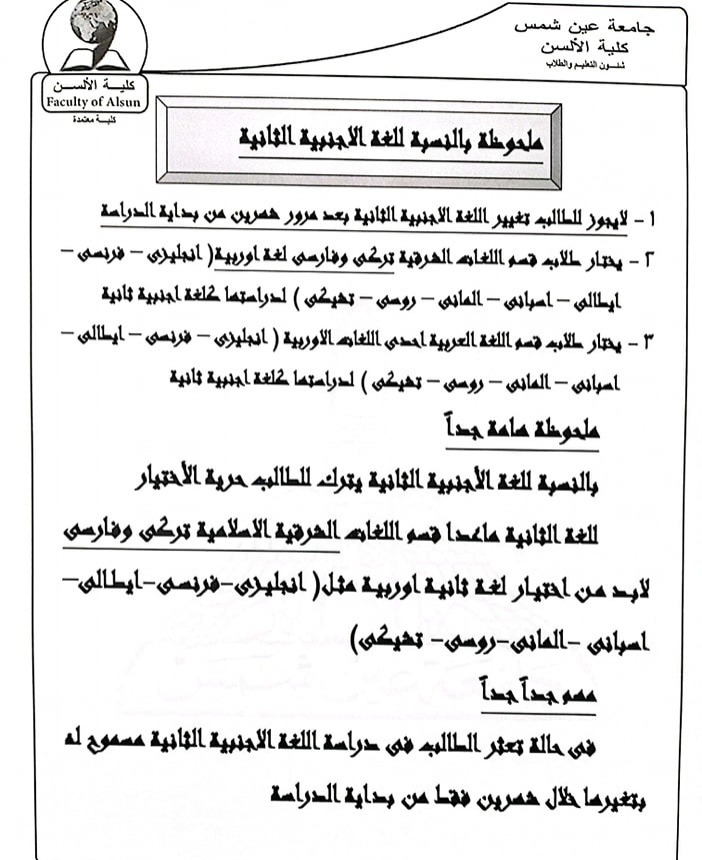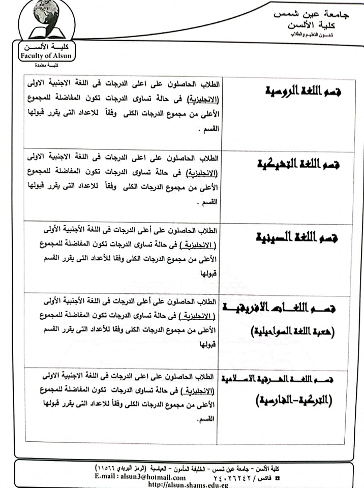 ألسن عين شمس تعلن شروط الالتحاق بالأقسام للطلاب المستجدين خلال العام الدراسي الجديد