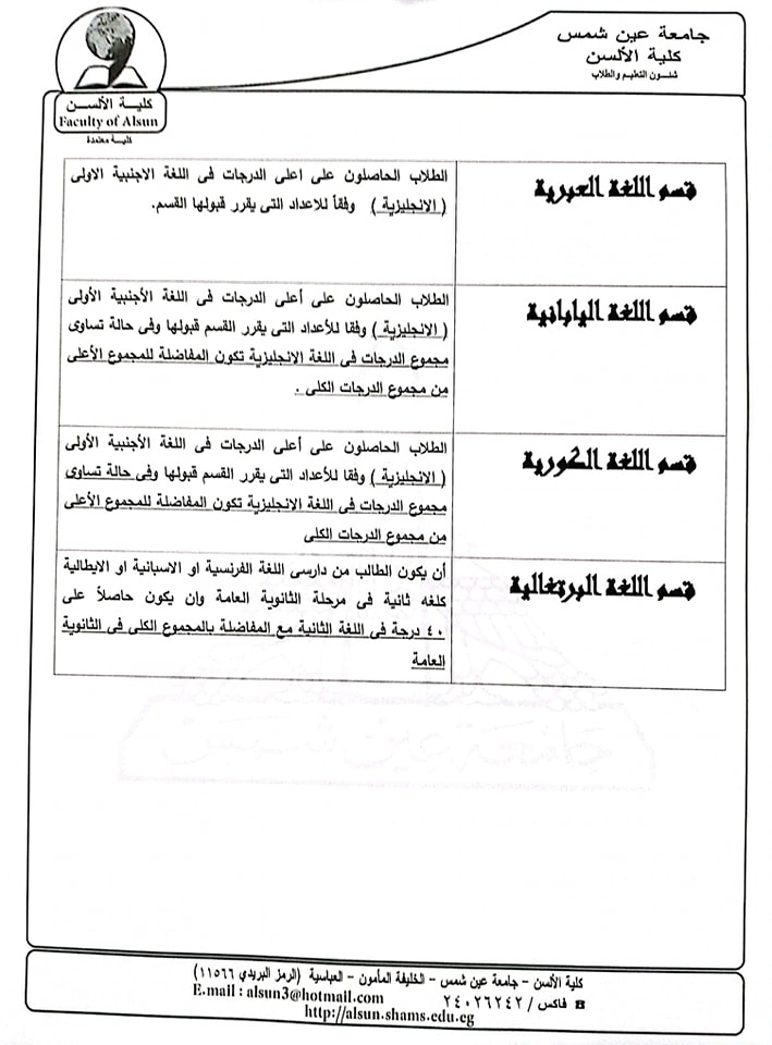 وأوضحت كلية الألسن بـ جامعة عين شمس، أن قسم اللغة الإسبانية للطلاب الدارسون للغة الأجنبية الإسابنية والطلاب الدارسون للغة الأجنبية الثانية (الفرنسية) والحاصلون فيها على أعلى الدرجات وفي حالة تساوي الدرجات تكون المفاضلة للمجموع الأعلى من مجموع الدرجات وفقًا للأعداد التي يقرر القسم قبولها.