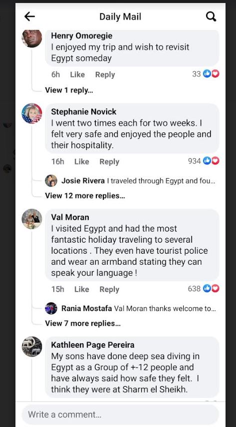عندما نشرت صحيفة ديلي ميل التقرير عبر صفحتها بـ فيسبوك، انهالت التعليقات المعارضة لما يتم تداوله، حيث انطلق العشرات من المواطنين ذوي الخلفيات المختلفة والجنسيات المتنوعة، يروون تجربتهم في مصر.