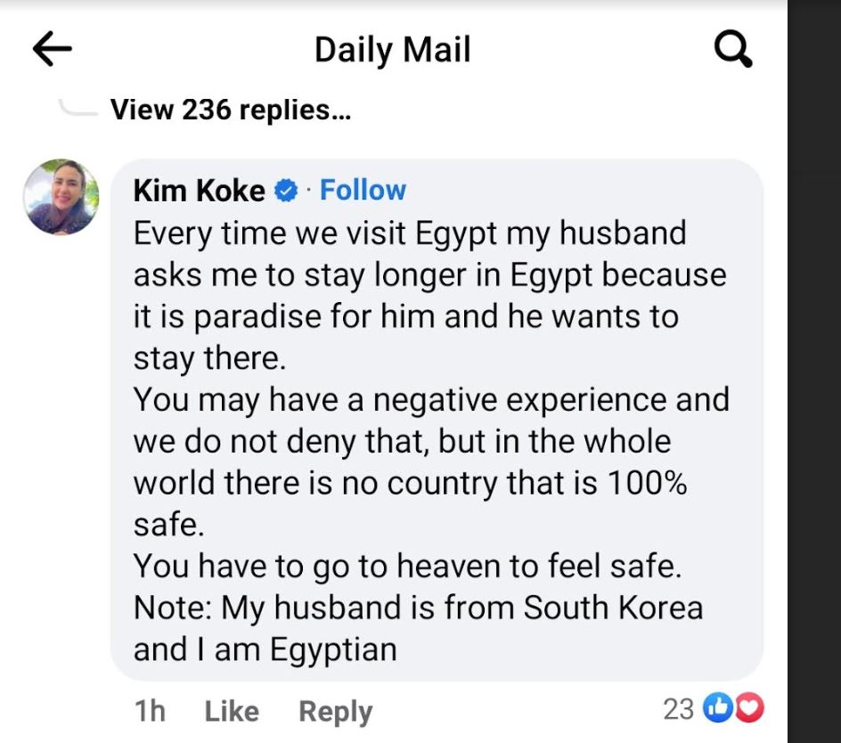 كما شهدت التعليقات أيضًا مجموعة كبيرة من المصريين الذين قرروا الدفاع عن بلدهم، وبث الطمأنينة لدى قلوب الأجانب الذين يزورون مصر، مشيرين إلى أن المحروسة آمنة تمامًا وشعبها يرحب بجميع الزائرين.