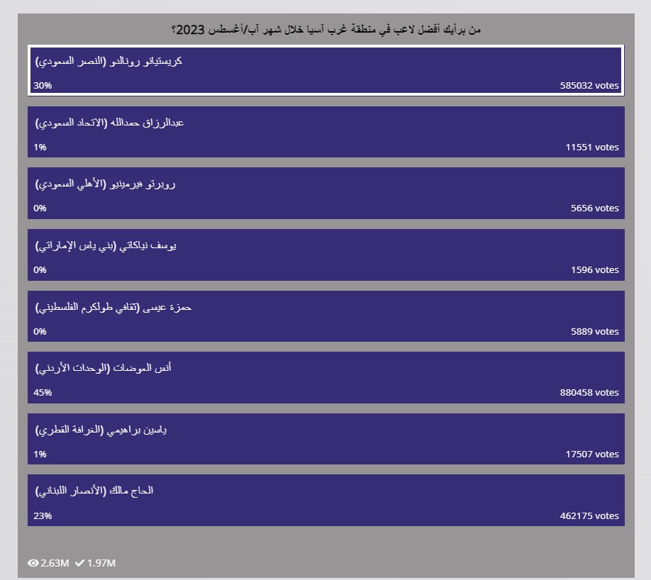 اشتدت المنافسة بين رونالدو مهاجم النصر والحاج مالك لاعب الأنصار اللبناني، حيث تتقارب أرقام اللاعبين، ونستعرض معكم فيما يلي رابط استفتاء أفضل لاعب في غرب آسيا لأغسطس 2023، وخطوات التصويت للاعب المفضل إليك، وسينتهي الاستفتاء اليوم في تمام الساعة 8:00 مساءً بتوقيت القاهرة والسعودية.