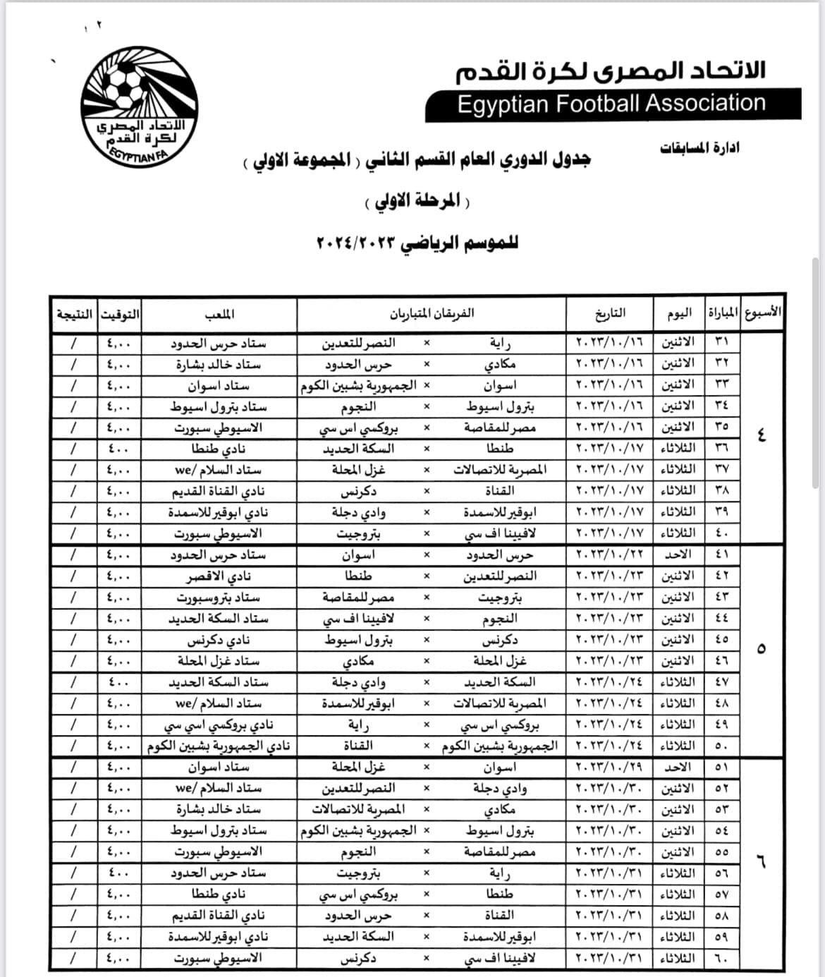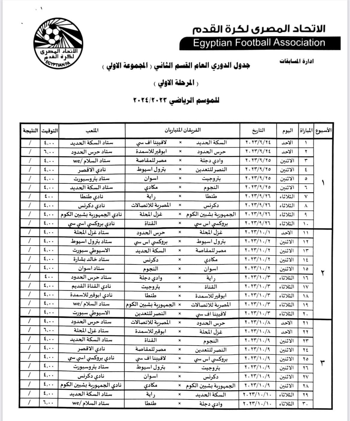 أعلنت لجنة المسابقات بالاتحاد المصري لكرة القدم عن جدول مباريات الدور الأول لدوري القسم الثاني المحترفين في نسخته الأولى للموسم الرياضي 2023-2024.