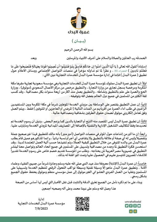 واختتم البيان: عمرة البدل -الإنابة- معروفة منذ عهد النبي صلى الله عليه وسلم وجائزة شرعا من جمهور الفقهاء وعلماء الأمة، وتطبيق عمرة البدل ما هو إلا وسيلة تقنية وسيطة تواكب التحول الرقمي لتنظيم الخدمة وتسهيلها على المسلمين ونقلها من العمل الفردي العشوائي غير الموثوق إلى عمل مؤسسي منظم وموثوق يحفظ حقوق الجميع بشكل رسمي.