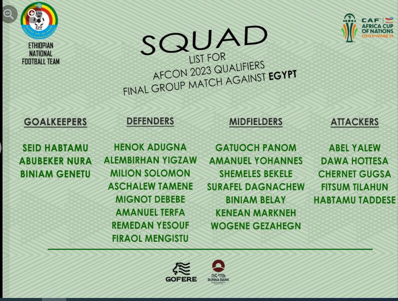 وعن تشكيل منتخب إثيوبيا المتوقع لمواجهة مصر اليوم في تصفيات أمم أفريقيا 2023، أعلن الاتحاد الإثيوبي لكرة القدم عن قائمة لاعبي منتخب إثيوبيا المشاركة في مواجهة منتخب مصر اليوم، وجاءت القائمة كالتالي: