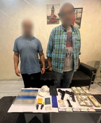 وعقب تقنين الإجراءات تم ضبطهما وبحوزة أحدهما السيارة سالفة الذكر، وبحوزتهما 2 طبنجة صوت وعدد من الطلقات الصوت ومبلغ مالي و3 لوحات معدنية.