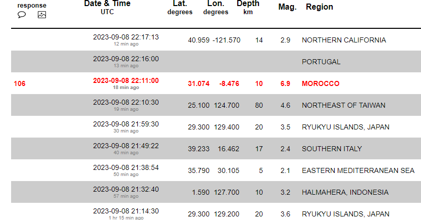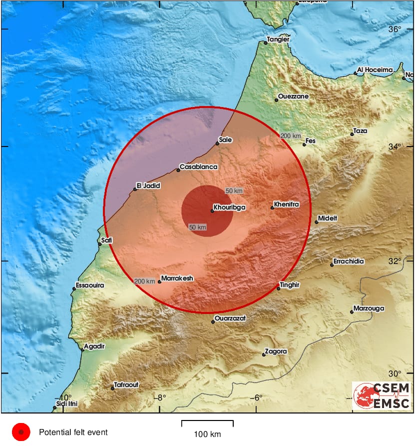 وحسب مركز الزلازل الأورومتوسطي، وقع زلزال المغرب على عمق 10 كيلومترات، وعلى بعد 16 كيلومتر من قرية تلات نيعقوب وسط البلاد.