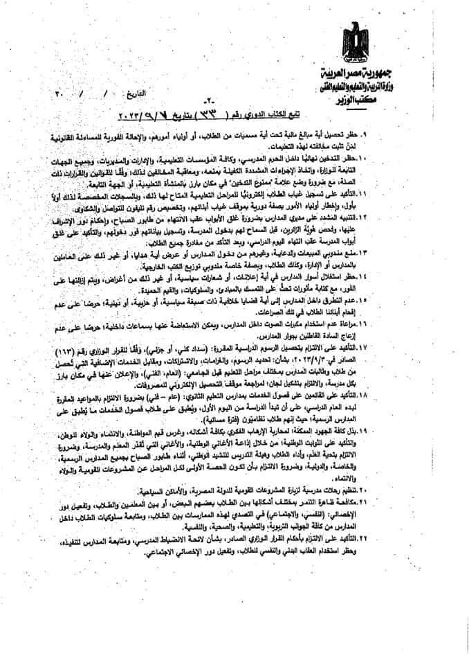 بالإضافة إلى ضرورة الالتزام بأن تكون الحصة الأولى لكل المراحل عن المشروعات القومية والولاء والانتماء، فضلًا عن مراعاة عدم استخدام مكبرات الصوت داخل المدارس، ويمكن الاستعاضة عنها بسماعات داخلية حرصا على عدم إزعاج القاطنين بجوار المدارس.