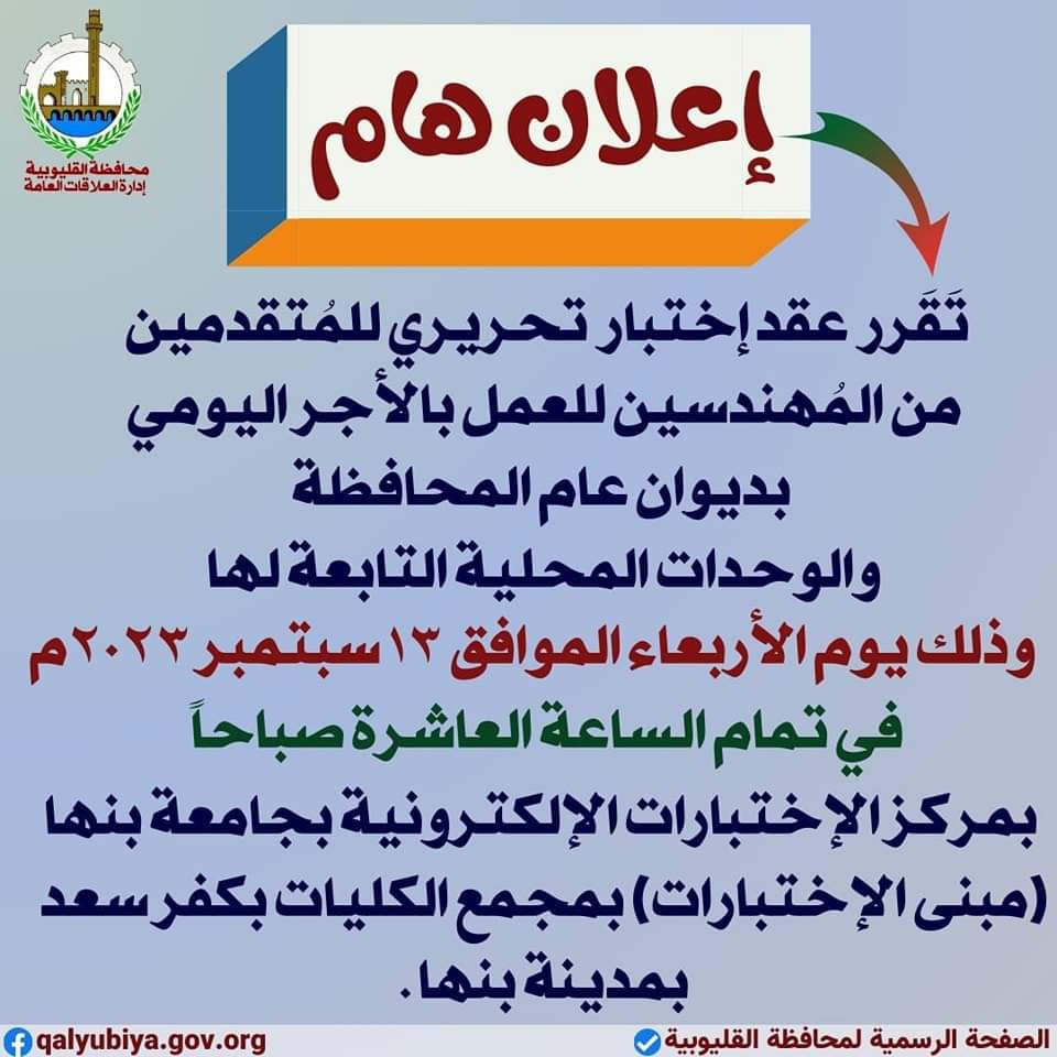يذكر أن محافظة القليوبية، قد أعلنت في وقت سابق وظائف جديدة لـ 119 مهندسا بالأجر اليومي للعمل بصفة مؤقتة بديوان عام المحافظة والوحدات المحلية للمراكز والمدن والأحياء والوحدات المحلية القروية التابعة، من الحاصلين على بكالوريوس الهندسة والزراعة.