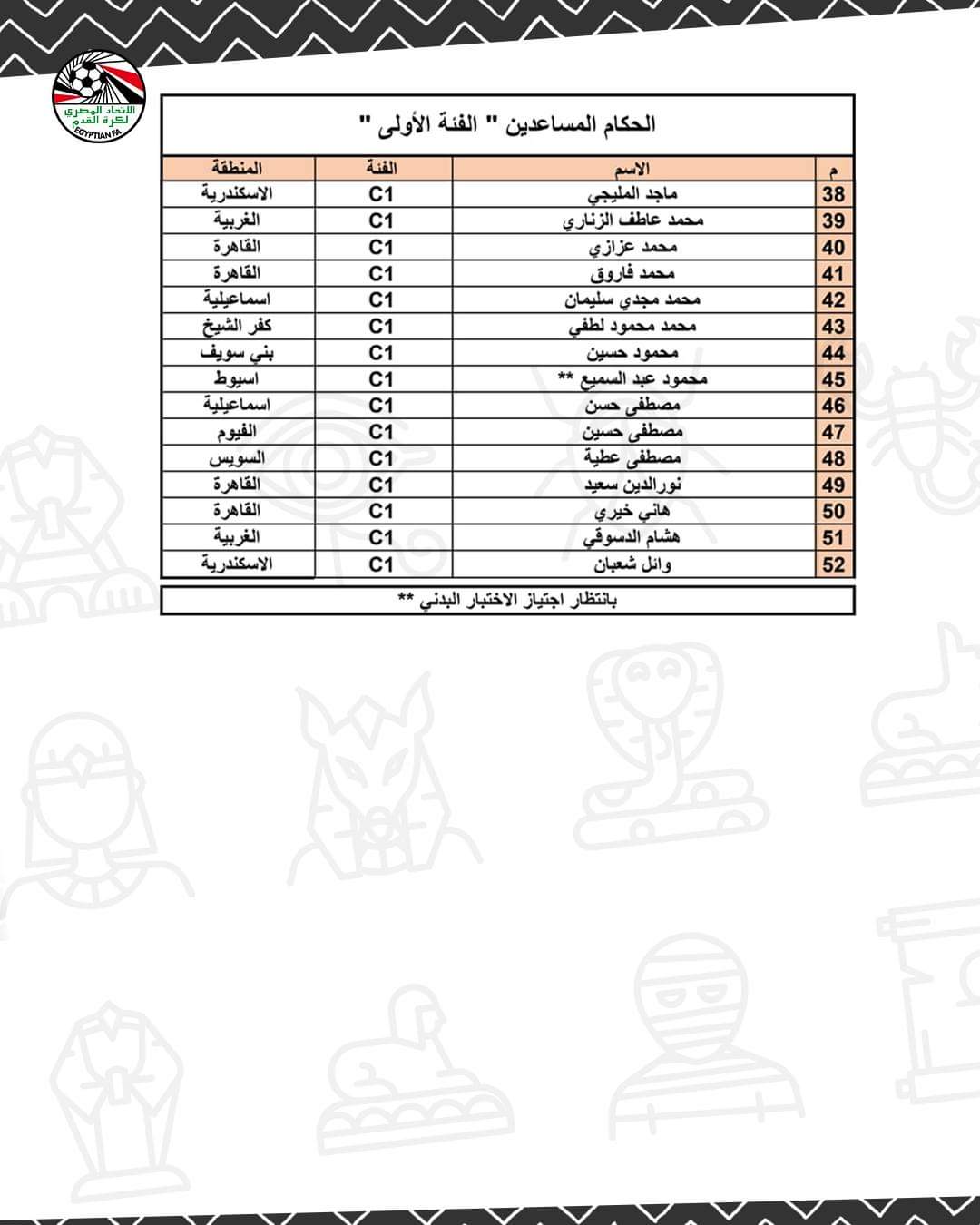 كما أصدر اتحاد الكرة قائمة مخصصة للحكام المساعدين، ضمت 52 مساعدا، فيما رهنت لجنة الحكام استمرار بعض هؤلاء الحكام ضمن القائمة باجتيازهم الاختبار البدني، بعدما رسبوا في الاختبار الأول.