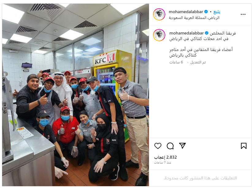 نشر محمد العبار رجل الأعمال الإماراتي البارز، صورة مع عمال أحد فروع مطاعم كنتاكي من العاصمة السعودية الرياض عبر موقع الصور الشهير انستجرام.