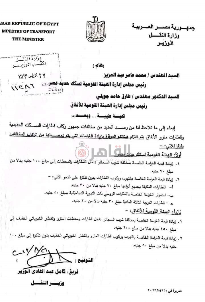 يأتي ذلك بعد اعتماد قرار الزيادة الجديدة من قبل وزارة النقل والمواصلات، حيث حصلت الشركة الفرنسية RATP على خطاب موجه من الفريق كامل الوزير وزير النقل، إلى المهندس طارق حامد جويلي رئيس مجلس إدارة الهيئة القومية للأنفاق، بضرورة الالتزام بالتعليمات الجديدة وتطبيق زيادة الغرامات على الركاب.