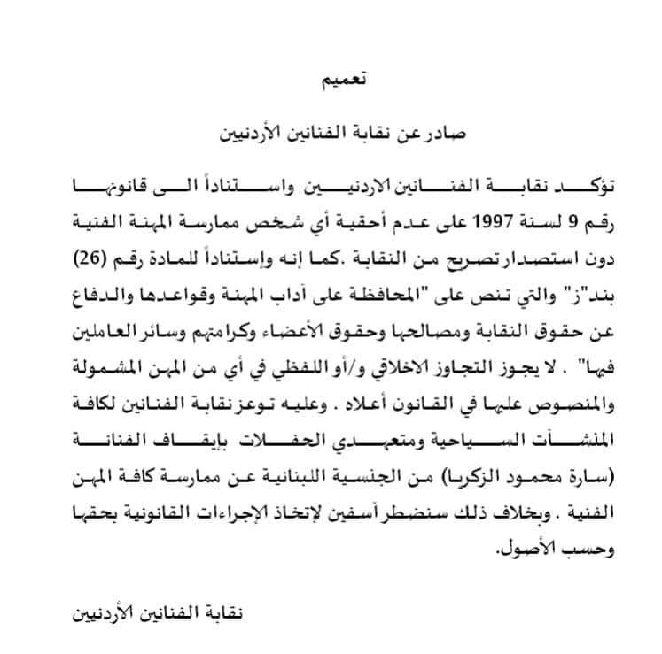 وأصدرت أمس نقابة الفنانين في الأردن، قرارًا بإيقاف سارة زكريا من ممارسة كل المهن الفنية، وذلك لعدم استخراجها تصريحًا من النقابة، وعدم محافظتها على آداب المهنة وقواعدها.