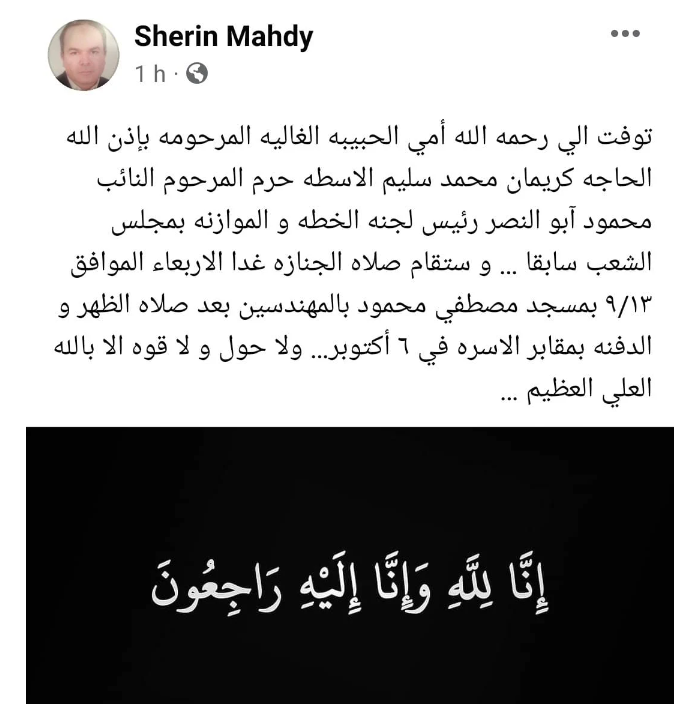 وأعلن شيرين نجل الراحلة كريمان، عن وفاة والدته، حيث كتب منشورًا، عبر حسابه الشخصي بموقع التواصل الاجتماعي فيس بوك، قال فيه: توفيت إلى رحمة الله أمي الحبيبة الغالية المرحومة بإذن الله، الحاجة كريمان محمد سليم الأسطة، حرم المرحوم النائب محمود أبو النصر، رئيس لجنه الخطة والموازنة، بمجلس الشعب سابقا.