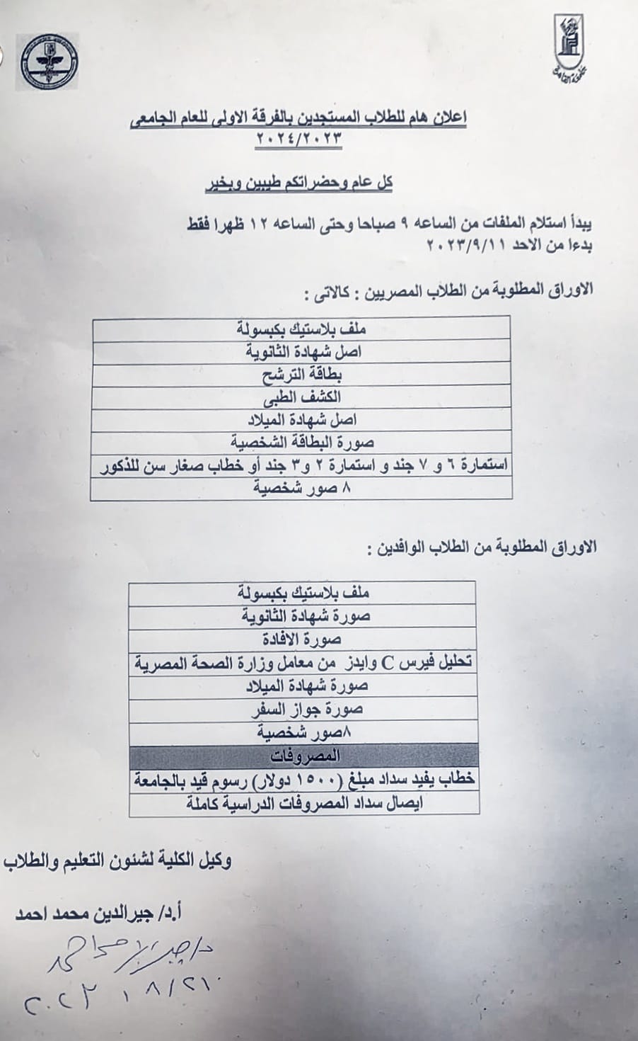 وجاءت الأوراق المطلوبة من الطلاب المصريين والطلاب الوافدين كالآتي: