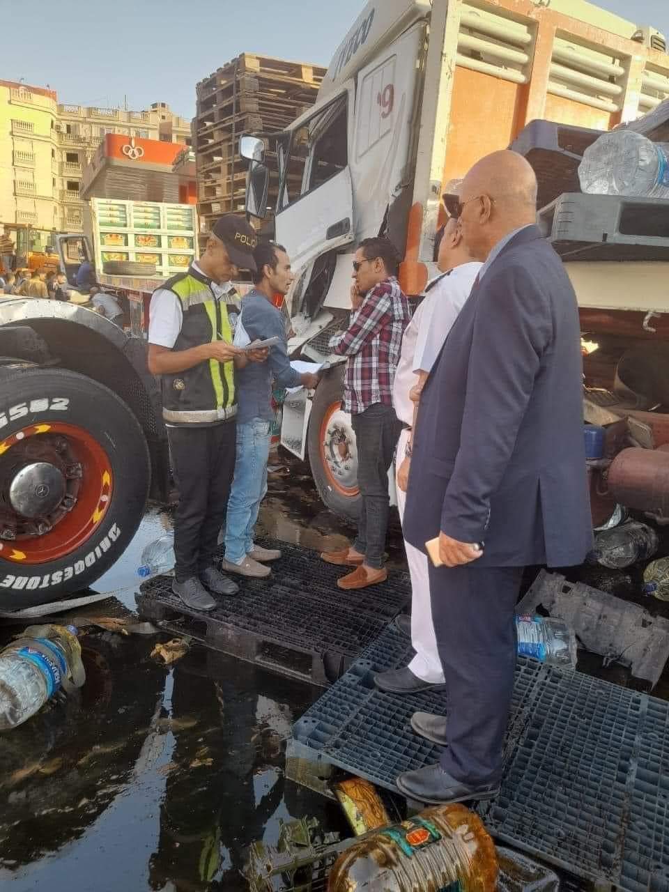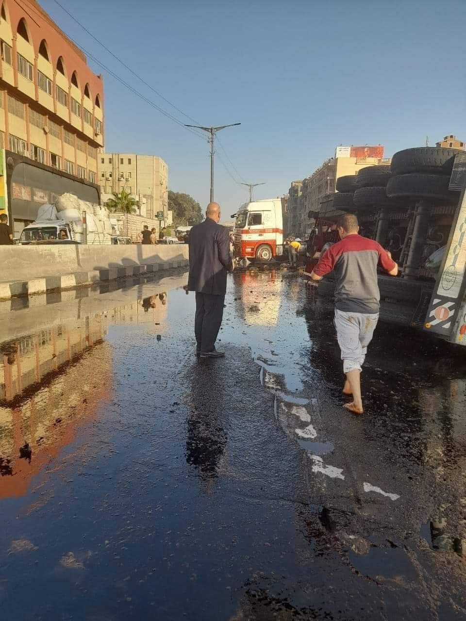 وتعود التفاصيل إلى تصادم سيارة نقل ثقيل محملة بمادة لزجة بعد انفجار إطارها، بثلاث سيارات، منها سيارتي نقل ثقيل والأخرى ميكروباص، خلال انتظارها بالقرب من محطة وقود على طريق القاهرة الإسكندرية الزراعي، وانقلبت السيارة المتسببة في الحادث وفرغت حمولتها بالمادة اللزجة على الطريق، ما أدى لشلل وكثافة مرورية عالية.