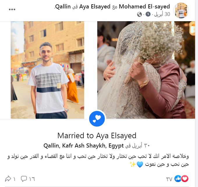 وتداول رود مواقع التواصل الاجتماعي بمحافظة كفر الشيخ صورا للشاب محمد السيد عبد الكريم، خاصة صور زفافه، حيث تزوج الشاب منذ قرابة أربعة أشهر، ثم سافر خلال الأيام القليلة الماضية للعمل، قبل أن يرد نبأ وفاته أمس عقب تعرضه لحادث أليم نتج عنه مصرعه.