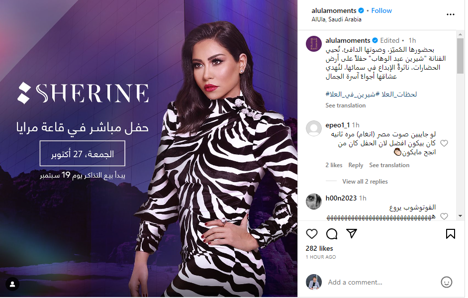 وأعلنت مدينة العلا بالمملكة العربية السعودية، عبر حسابها الشخصي على موقع تبادل الصور والفيديوهات إنستجرام، حفل المطربة شيرين عبد الوهاب، والمقرر إقامته يوم 27 أكتوبر المقبل على خشبة مسرح قاعة ماريا بالمدينة.