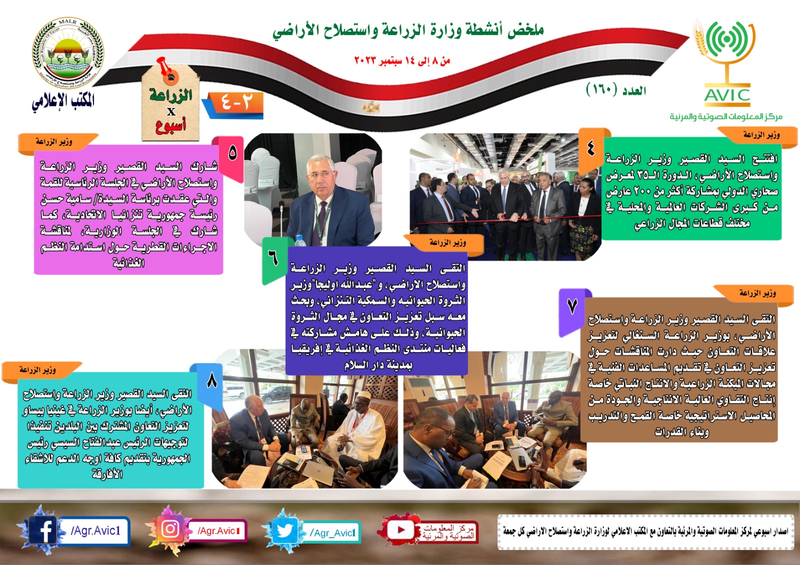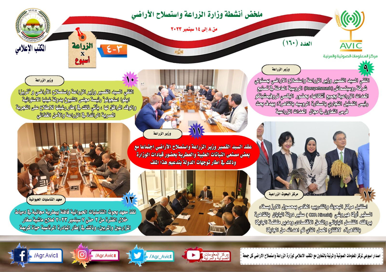 أصدر مركز المعلومات الصوتية والمرئية، التابع لوزارة الزراعة واستصلاح الأراضي، "الانفوجراف الأسبوعي" في نسخته رقم 160، حول الحصاد الأسبوعي لأهم أنشطة الوزارة، خلال الأسبوع الماضي في الفترة من 8 وحتى 14 سبتمبر الجاري.